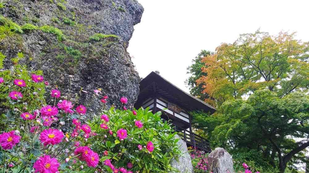 シュウメイギクから見上げる長楽寺 観音堂と紅葉に色づき始める木。