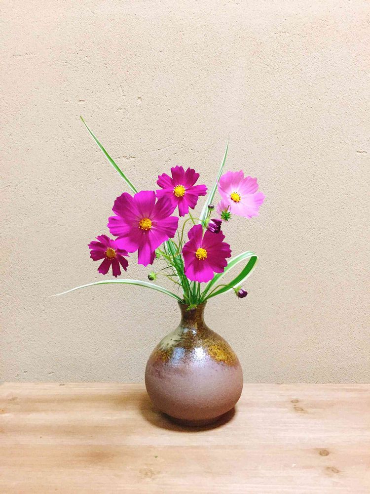 いただいたコスモスにオリヅルランを合わせました。花器を集めているところで、この花器は丸みと渋さが気に入りました(╹◡╹)