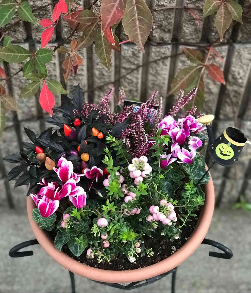 甘めのハロウィン🎃寄せ植え〜素敵ですね。ミニシクラメン、そして今しもむら園芸さん?のビオラなど…早いですね。