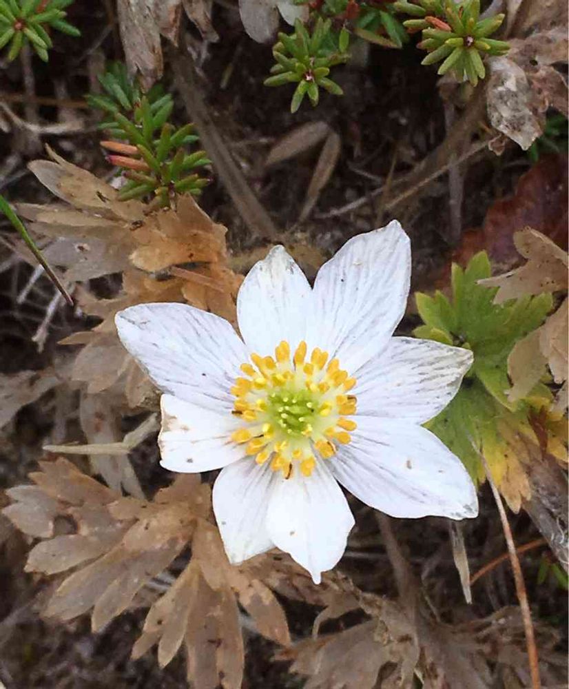 白山一花。葉が広く、先がとがっていなくて、花の柄が短く、東北地方以北の高山に咲くのが、エゾノハクサンイチゲとあるので、てっきりそう思ったのは無理もない。山形県の月山の頂上付近で見たからだ。1984mの月山はちょうど紅葉見頃。頂上辺りから広がるカール状の斜面は9月末が得もいわれぬ錦秋の絶景だったようだ。いまは草紅葉が黄色から栗色に染まりつつあるとき、一輪見つけたのがこの可憐な花。月山の公式パンフには、ハクサンイチゲと書いてある。果たして、判別不能。修験者や参拝者が列をなして登っているこの霊峰に一輪の祈りのような佇まい。遠征の得がたい収穫だった。