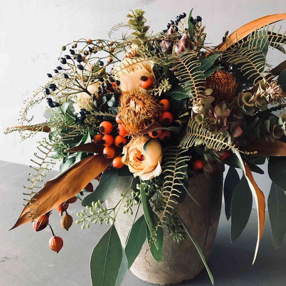 木製の棚に置く目的で高さ幅が決まっているので、それに合わせての生花とドライフラワーのアレンジをしました。