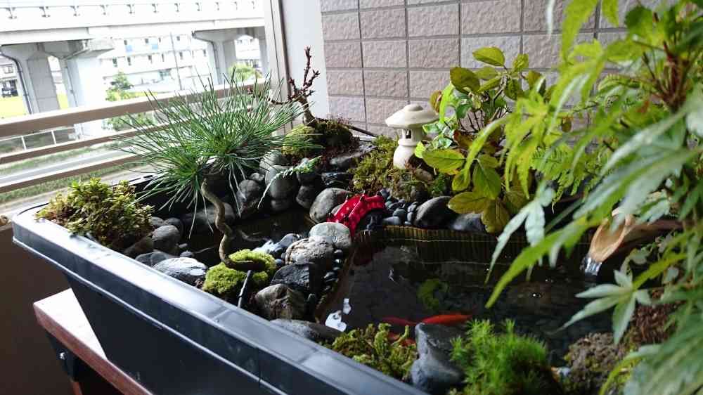 マンションで庭がないので、ベランダに小さな箱庭を作りました。