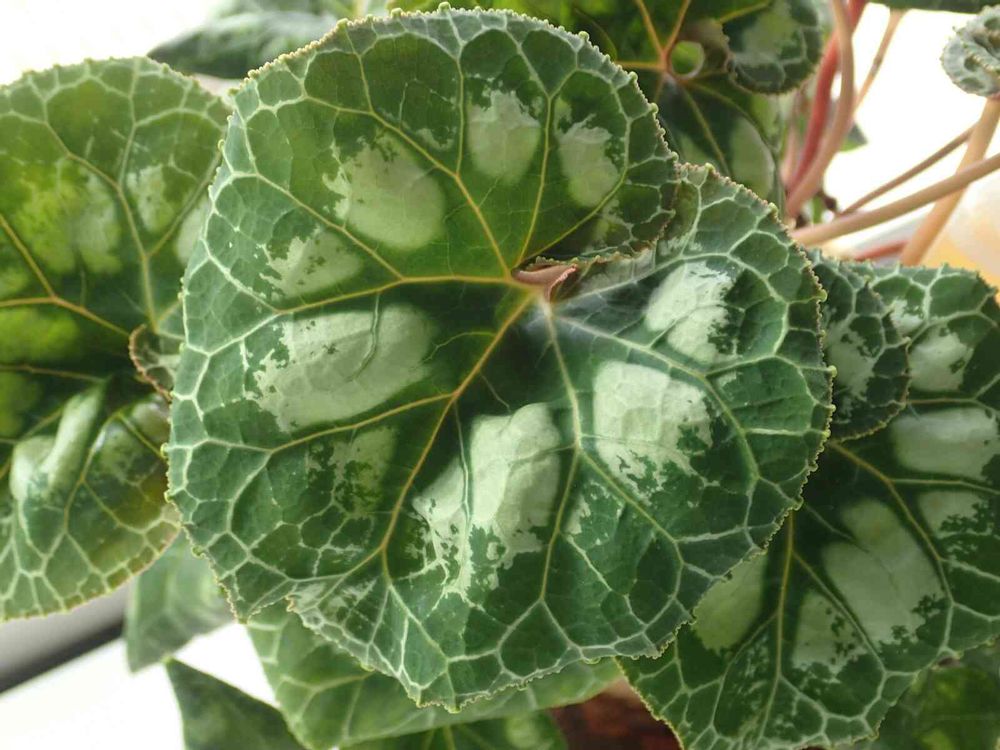おはようございます。今朝は職場で育てているシクラメンです。休眠せず花をつけながら夏越ししました。若い葉は特に模様が美しく、また、触るとしっとりしています。一年中楽しむことが出来る植物ですね。
