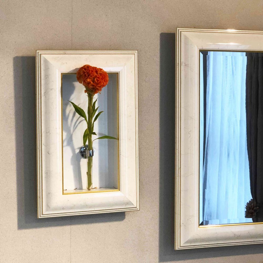 花器(フラワーボックス)はミラーフレーム(壁掛けの鏡額)を作る際に、額屋さんに頼んで一緒に作ってもらったもの。