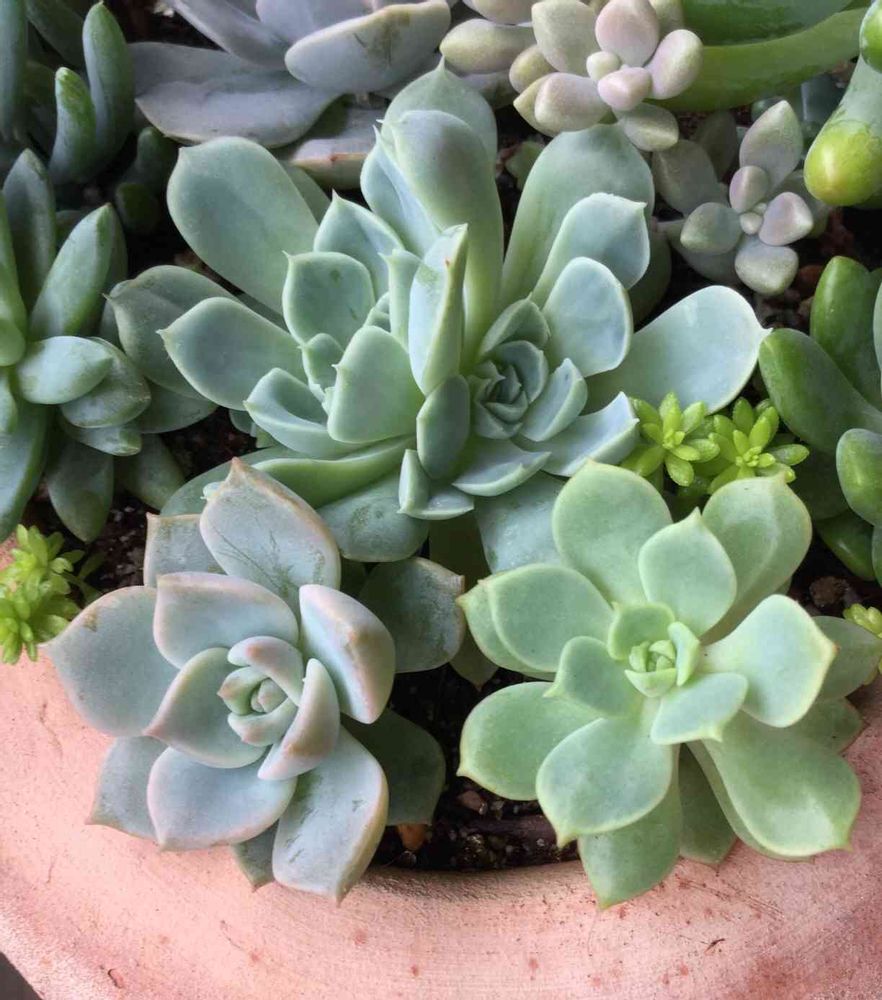 淡い色合いの子達が詰まった鉢です。中央、イリア、左下白牡丹、右下、噛みつかれたデレンオリバー(この角度だと歯型が上手く隠れていますが^^;)