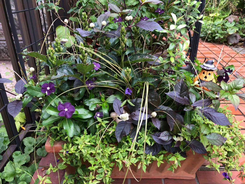 アカバセンニチコウの黒い葉っぱが、光っててコウモリが飛んでるようにも見えてハロウィン🎃ムード満点ですねぇ〜🎶カッコいい