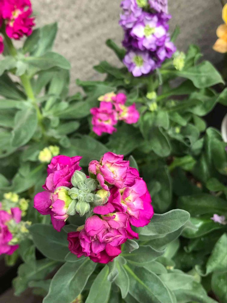 ストックとパンジーの寄せ植え、素敵だと思います。