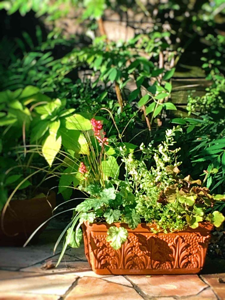 小さな庭,寄せ植え,朝日に照らされての投稿画像