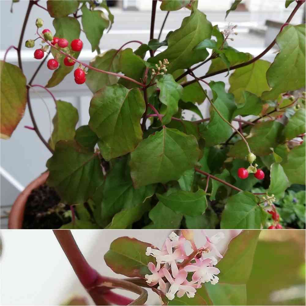 時計草が枯れてしまいました🤣なので、そこにジュズサンコを植えました💗下は拡大したジュズサンコの花です 赤い実が可愛くって 毎日、みてると嬉しくって😊♬♡