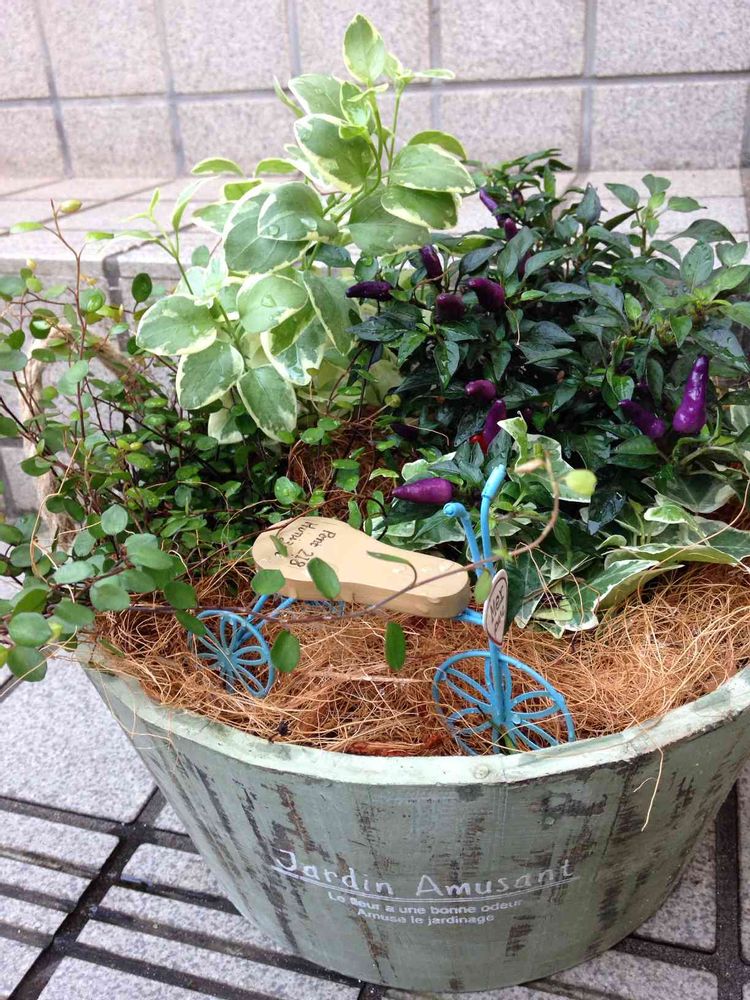 ツルニチソウ、アイビー、エアープランツ、鑑賞用のトウガラシに自転車を添えて