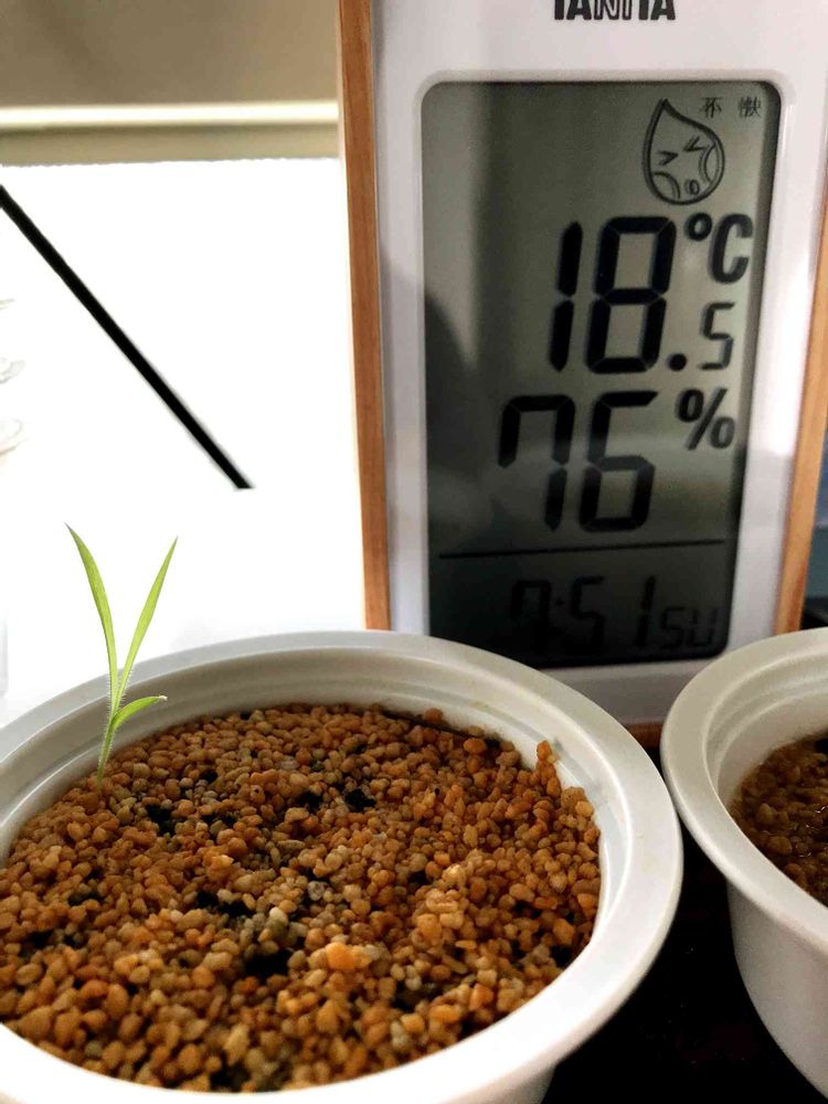 アルブカ・コンコルディアナ。蒔いて数日で芽が出てここまで成長。どの時点で腰水から普通の土に移すか考え中。5個蒔いて1つだけなので、こちらも確率は低い。室内では風がないので、葉っぱが巻く姿はまだ見られないかも。
