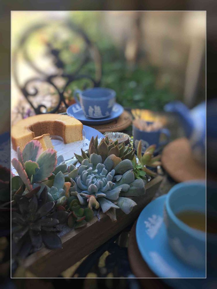多肉さんとカップ☕のカラーが合っていて、素敵なティータイムデスネ✨