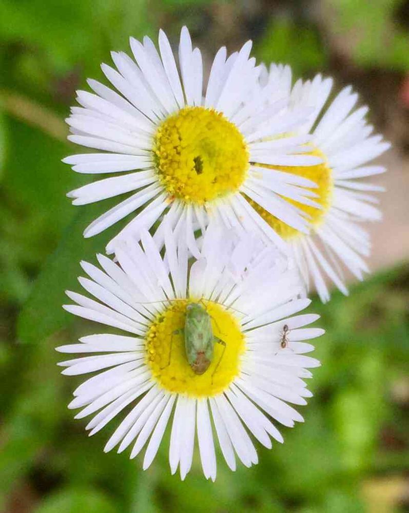 ヒメジョオンの花にカメムシとアリ