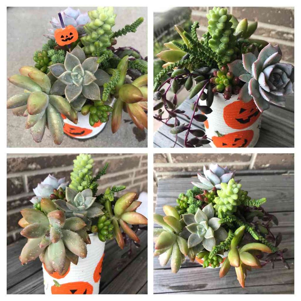 45さんから頂いたハロウィンリメ缶🎃に寄せ植えしたのですが、なんともまぁ纏まりのない寄せ植えになってしまって申し訳ない😭