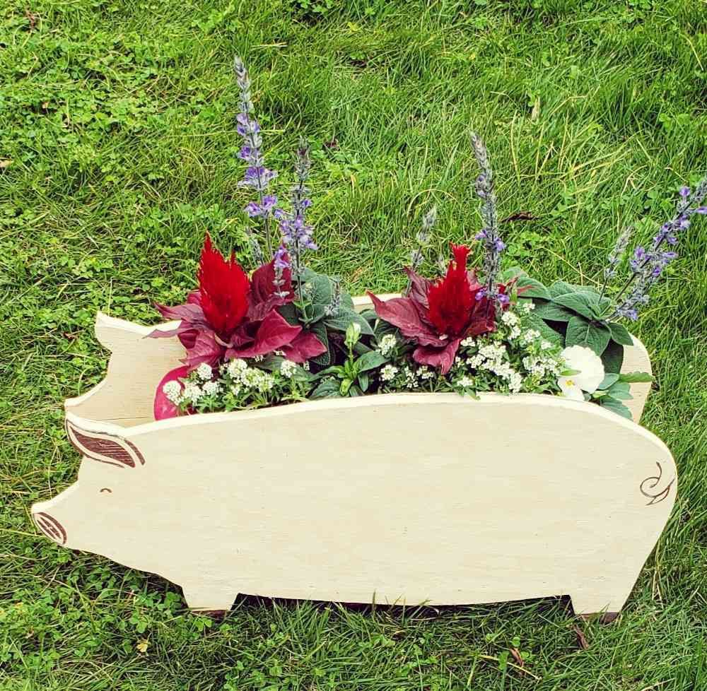 何年も前に作って、実家に放置されていたブタさんプランターに、フラワーパークで買ってきた花苗を植えました。