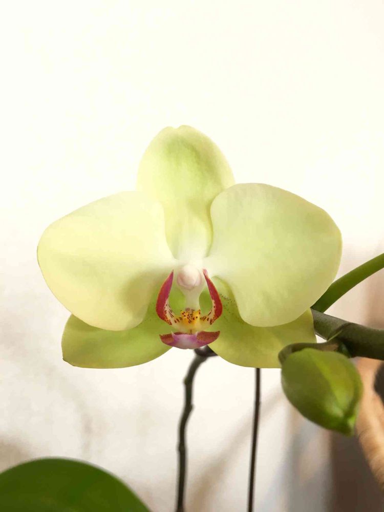 花、咲きました。涼しげな黄緑色のミディ胡蝶蘭でした。ギフト落ちで我が家にやってきて9ヶ月、花芽見つけてから3ヶ月。ようやくお顔拝見、となりました。