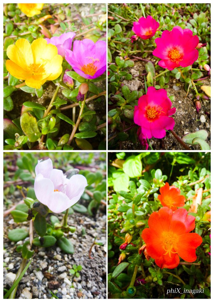 訪問先の街の駅までバスを待つ間に駅の周りの花壇で色とりどりのカワイイ花を見ました。横に広がってから周りで咲く変わった感じでした。しらべてポーチュラカと判りました。