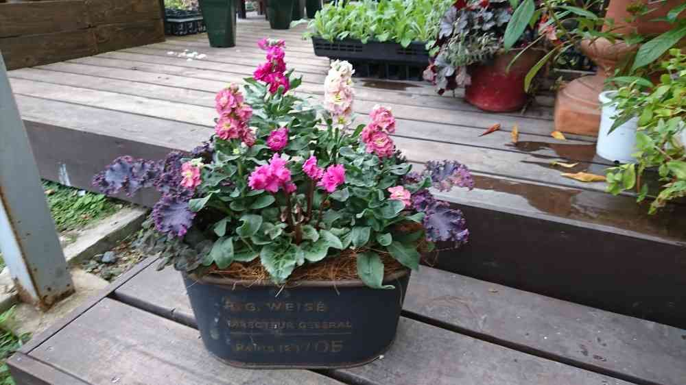 #夢と緑を運ぶホピー#有限会社鈴蘭園#神戸市北区園芸店#花屋#ガーデニング#花のある暮らし#植物のある暮らし#寄せ植え#エレガントケール#ヴィヴィアン・ビスチェ#八重咲き銀葉ストック#ベイビー#ヴィンテージ・カッパー#フリル咲きガーデンシクラメン#メティスポンポン#リシマキア#ミッドナイトサン#甘い香りがお薦め#ケールの葉色の変化が楽しみ @ ホピー鈴蘭園