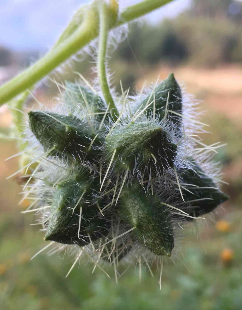 荒地瓜。侵略的外来種ワースト100に名を連ねる、いわば「植物のギャング」。圧倒的な繁殖力で覆いかぶさり、他の植物への光を奪って枯死させる。いまや全国に拡散して、猛威をふるっている。その果実。見るからにトゲトゲしく、鳥も食べないが、落下した種子を食べ、拡散しているようだ。類は類を呼ぶとはよく言ったもので、花に誘われてくるのはスズメバチで、うっかり繁茂したアレチウリを抜こうとすると、スズメバチに襲われることになる。北アメリカが原産と知ると、「むべなるかな」と思ってしまう。