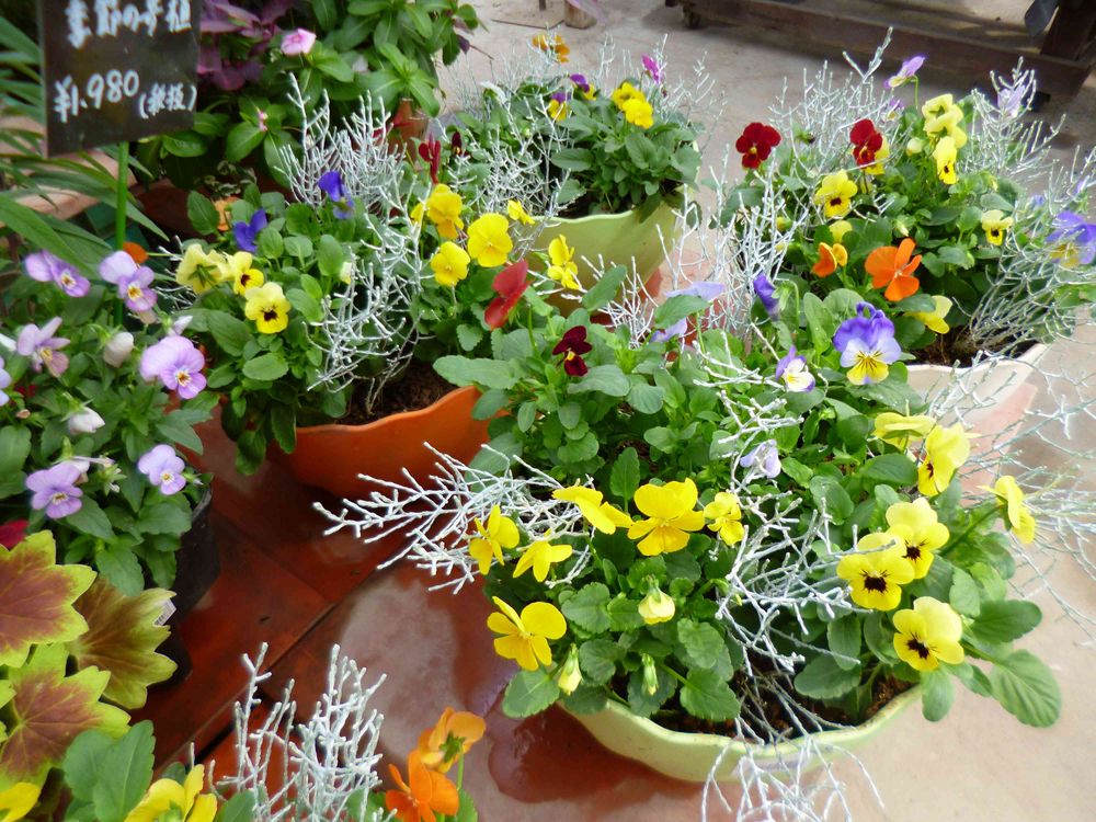ビオラの寄せ植えがお店の正面に並びました!季節の人気者ビオラに細く面白いクッションブッシュが添えられています。是非真似てひとつ作ってみてください。クッションブッシュの配置がポイントです。