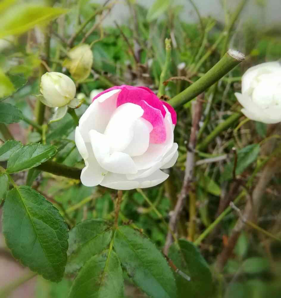 白い花が少しピンクがかって来る花は見ますが花びらがきれいに別れていていて面白いです😄