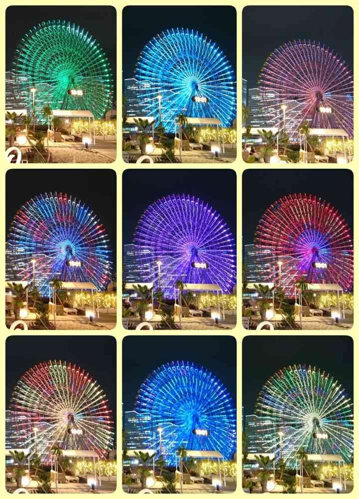 みなとみらいの観覧車、緑色なのだけど(左上の画像)15分ごとに色が変わるの🎡