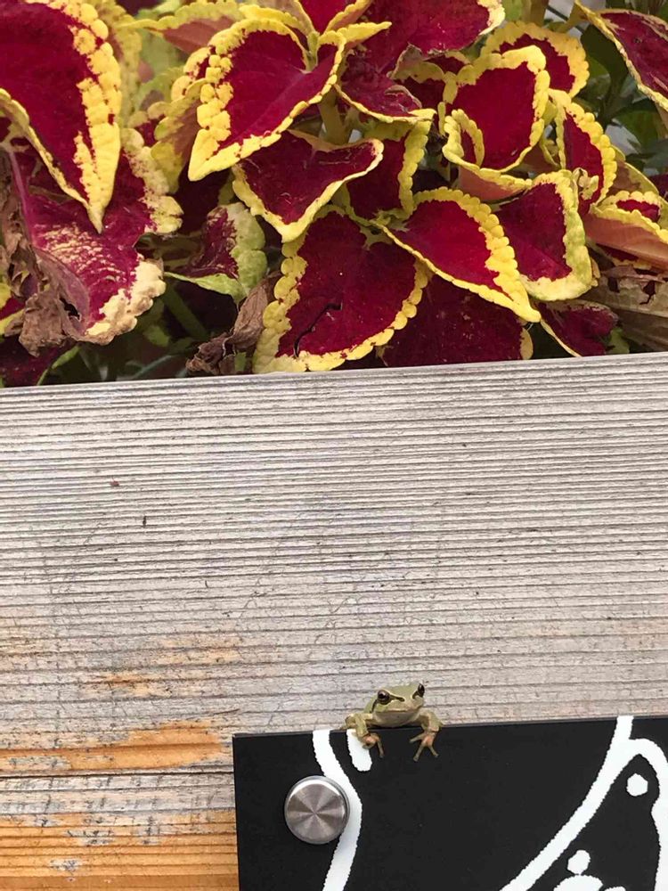 コリウスの後ろの方に写真を撮るコーナーがありますが、カエルちゃんもカメラ目線でお出迎え🐸笑笑
