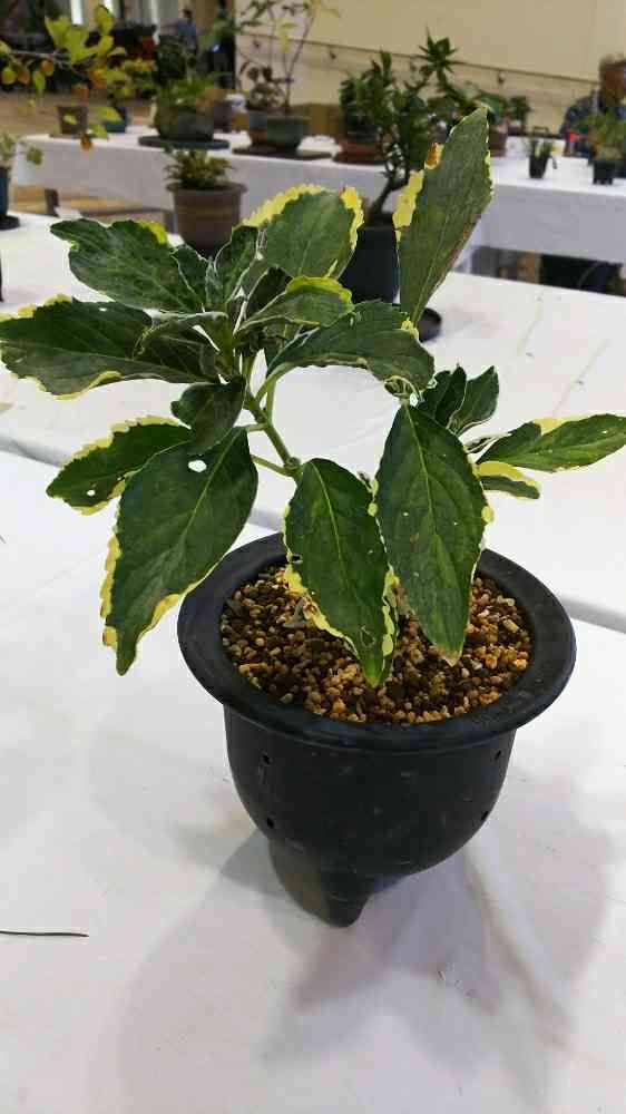 展示会に飾った極黄覆輪のアジサイです。出芽は雪白で後冴えで黄が乗ります。
