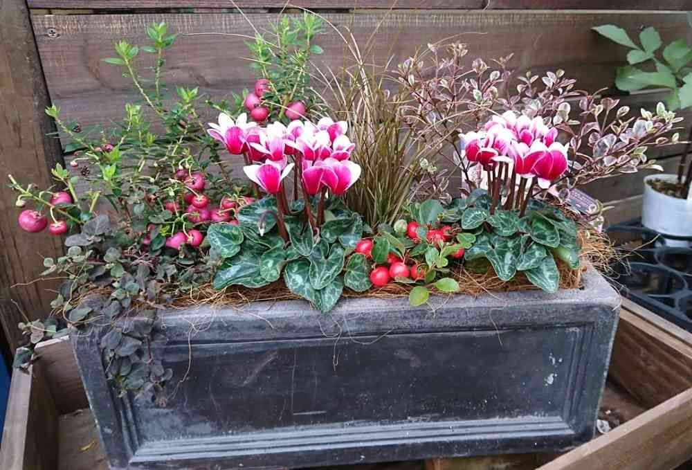 シンプルなグラスファイバーの植木鉢にクオリティ抜群のガーデンシクラメンと秋らしい実物、カラーリーフと一緒に寄せ植えしました。