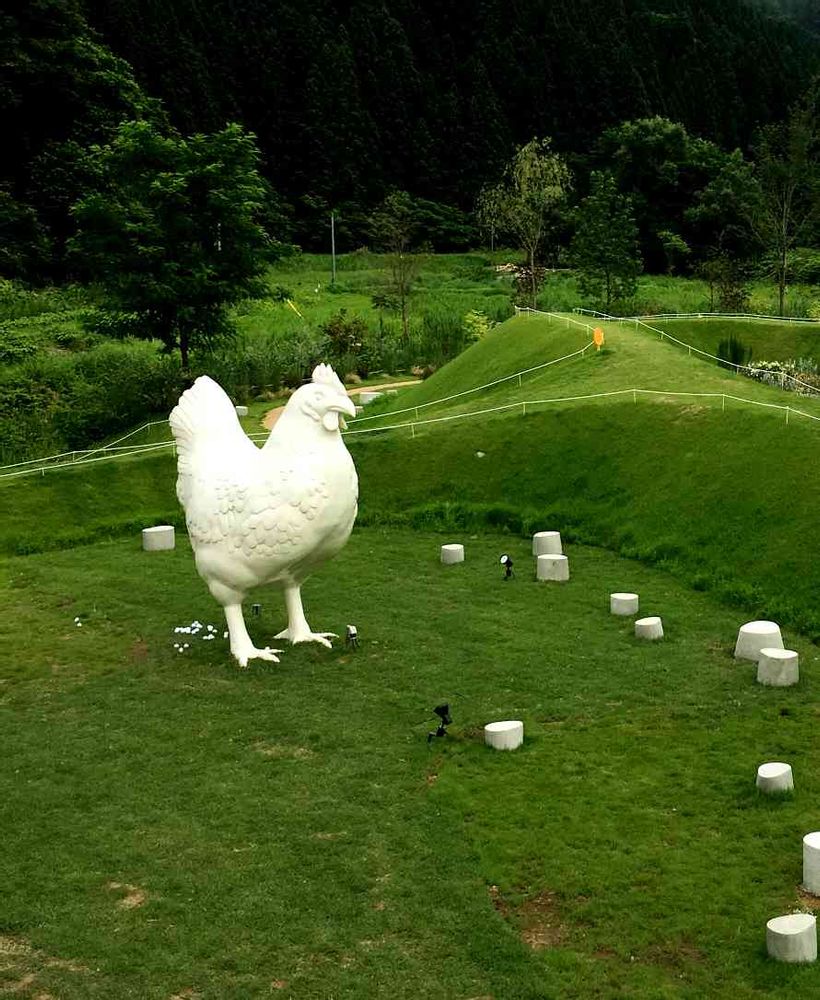 迫力ある鶏でした!本物の鶏もいて、奥はすこしアスレチックみたいな遊具とかお花の花壇がありました〜〜😆