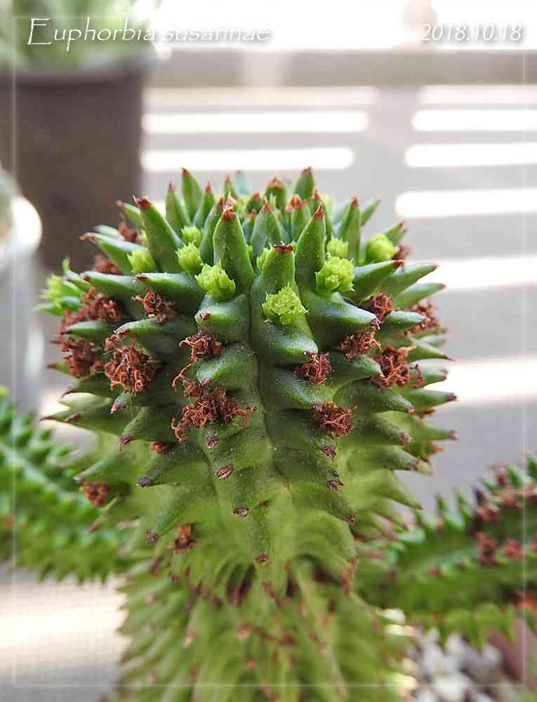 ユーフォルビア、スザンナエ(瑠璃晃)。別名、我が家の鉢植えゴジラ。花がほころび始めました。もうすぐ「頭が花畑」になります。