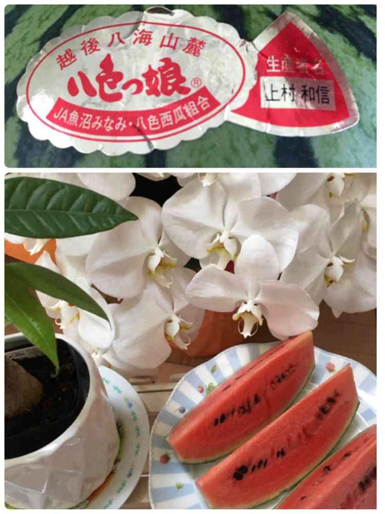 スイカ🍉美味しそう〜胡蝶蘭とスイカのコラボ写真はきっとすごくレアだと思う〜〜😆