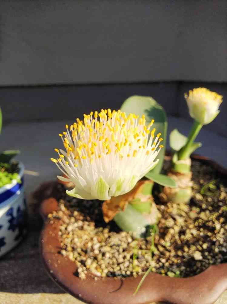 おはようございます☀️マユハケオモト咲いて来ました😀葉が貧弱でちょっとかわいそうだけど頑張って咲いてます‼️