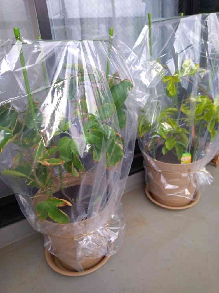 セリアで売ってたビニールのゴミ袋を代用して、パッションフルーツを温室に!🌺