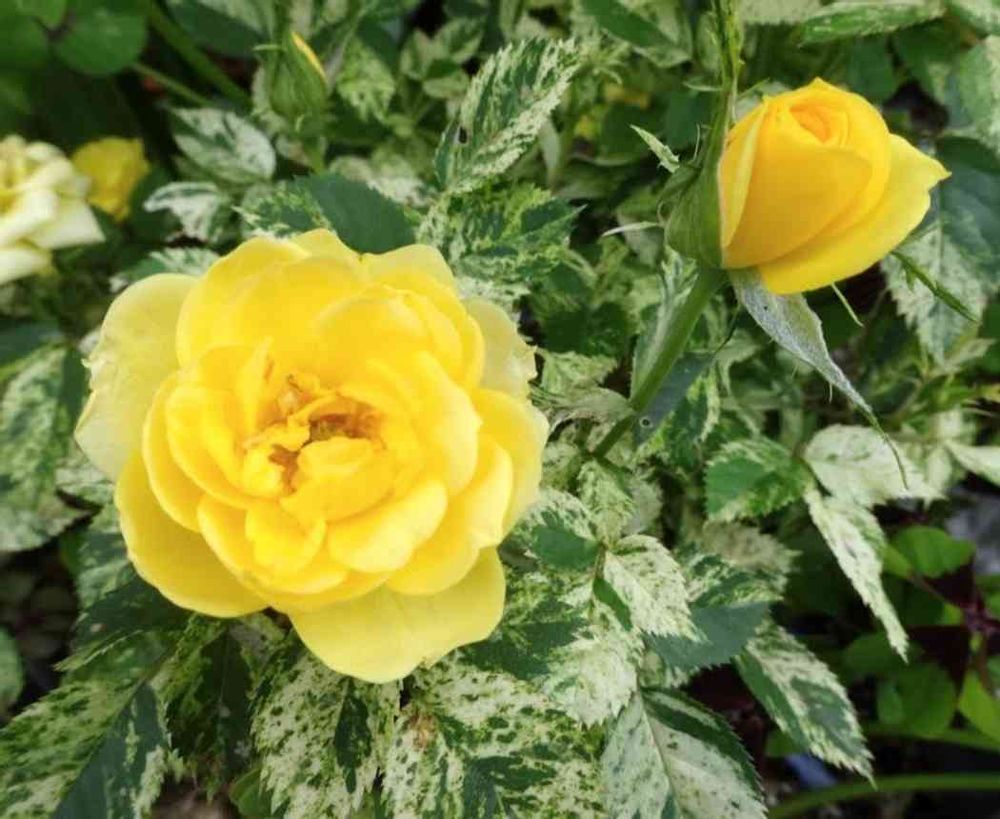 見たことありません❣️斑入りの花びらはありますが葉っぱはとても珍しいですよね🌱黄色のお花も可愛くて🌼!珍しくて美しいミニバラ、これからも大切に育ててくださいね🌱🌱