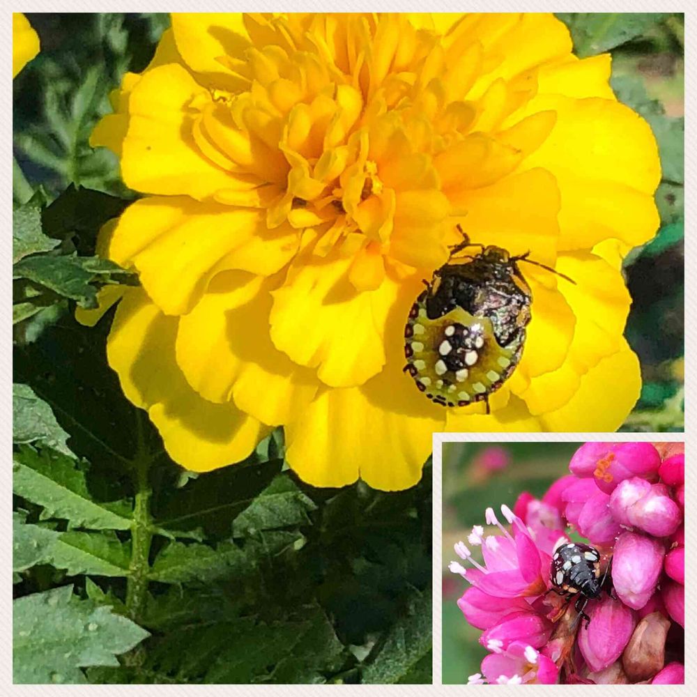 以前、オオケタデについていたアオクサカメムシの幼虫を投稿してましたが、もう少し大きくなったアオクサカメムシがマリーゴールドにいました。