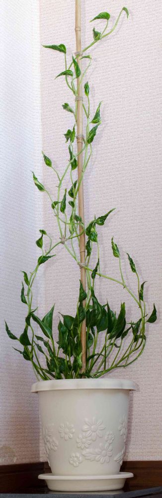 うちのホウレンソウアイドルのポトス・テルノシャングリラさん。屋内北側の磨りガラスの日光浴だけでここまで育ちました。こまめに霧吹きをしていたから茶色の葉っぱは皆無です♪ 冬にしなしなになるのかな……(T-T)