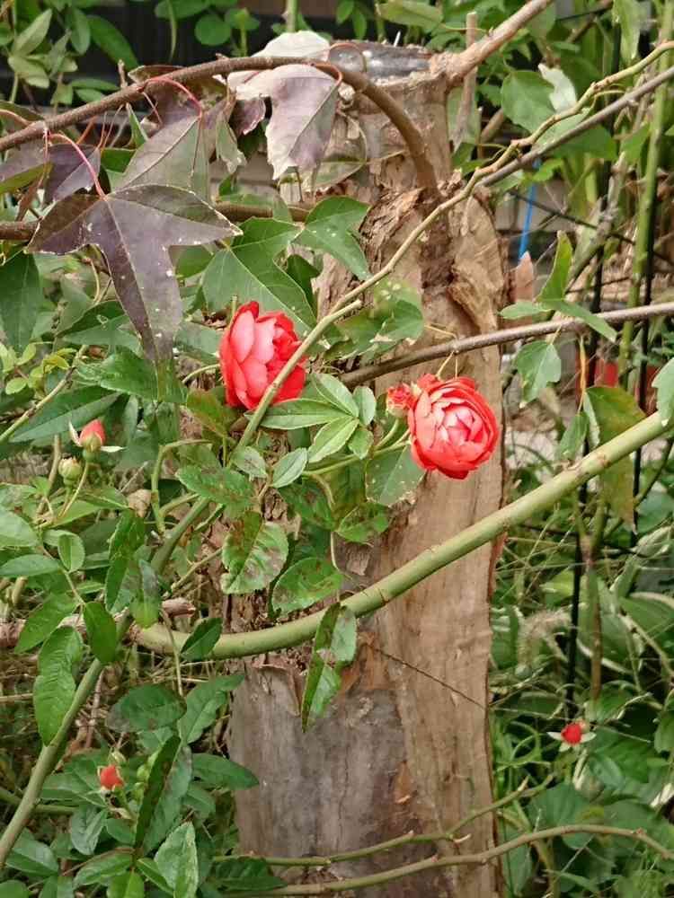 台風で根元から折れたカエデの木と一緒にラティスも壊れてしまったので、とりあえず枝をまとめてあるだけのつるバラ『オレンジ マザーズデイ』です。
