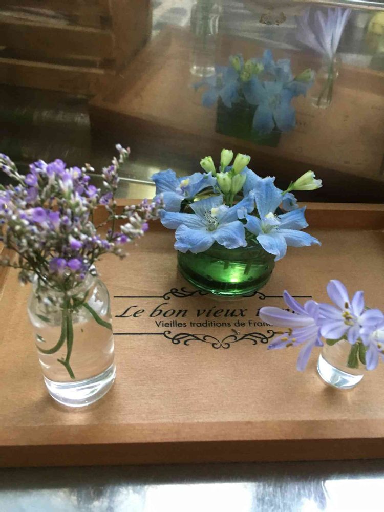 ☔で倒れて泥まみれになっていた庭先のストックとデルフィニィウム、ごろちゃんさんのみせていただき、飾ってみました。ありがとうございます✨