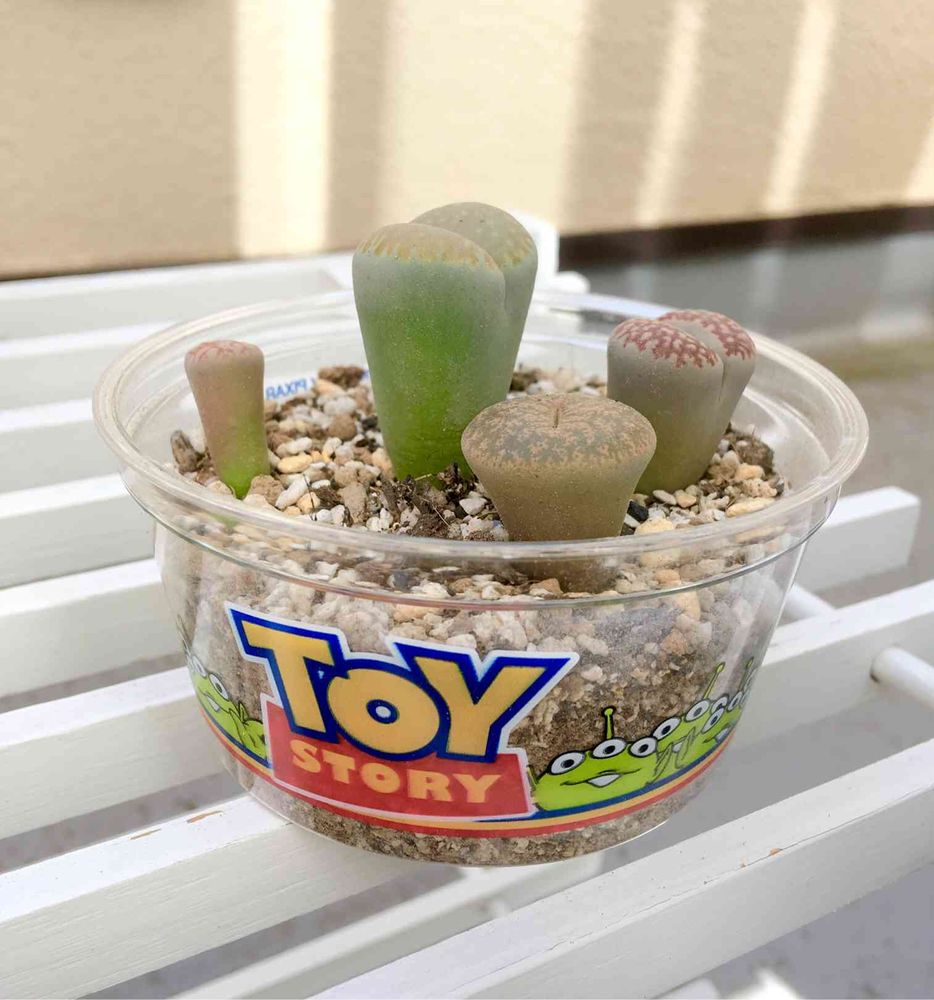 リトープスは夏越したのに2つ根腐れさせてしまったので小さいのに植え替えました😢シーのリトルグリーンまんの容器に錐で穴開け٩( ᐛ )و