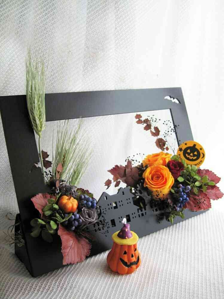 お花はほとんどがプリザーブドフラワー。この時期ならではのハロウィンカラーのバラです。