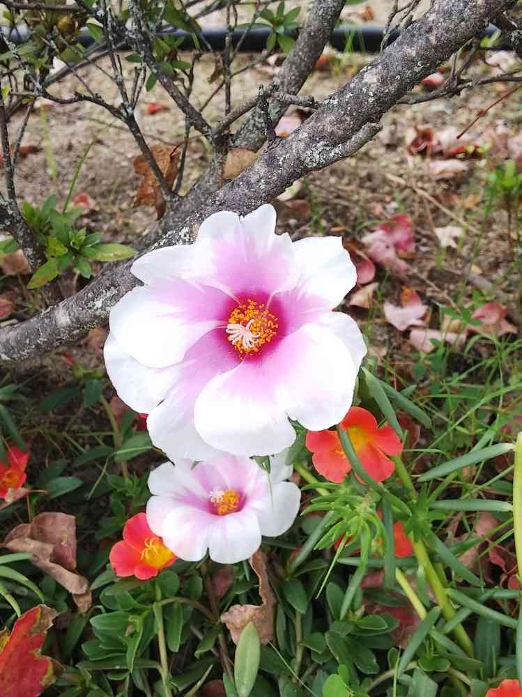 おはようございます☀️秋晴れ☀️が続いて気持ちいい季節‼️淡い色の松葉牡丹赤い中にあってひときわキレイ‼️