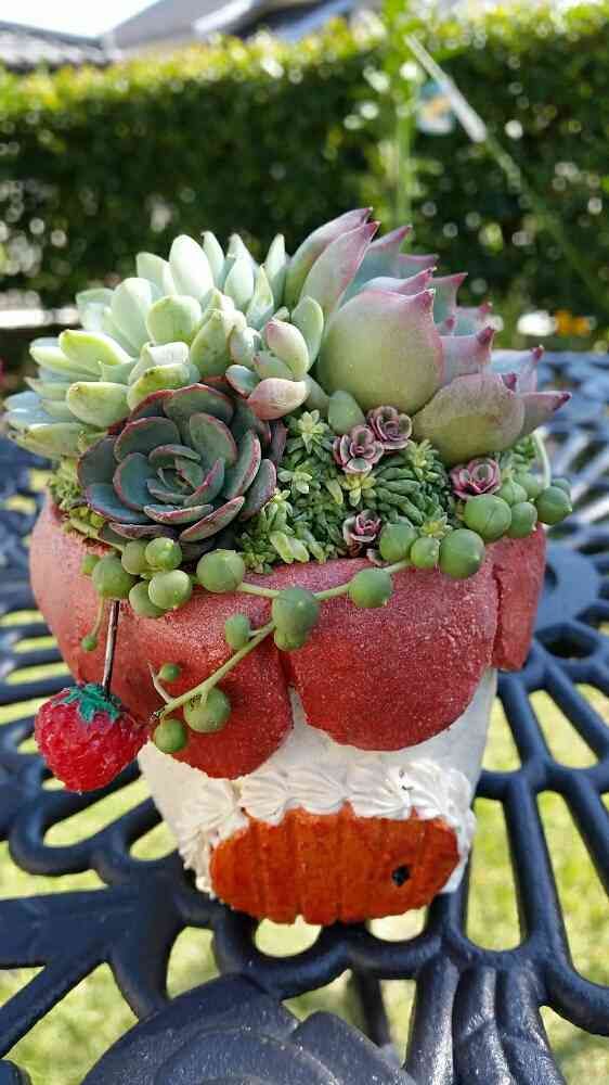始めて、自分が作った鉢に寄せ植えしてみました(*-ω人)お菓子の家?というより、豪華な家?ちょっとゴチャゴチャしすぎかな(-_-;)でも、出来てよかった❤