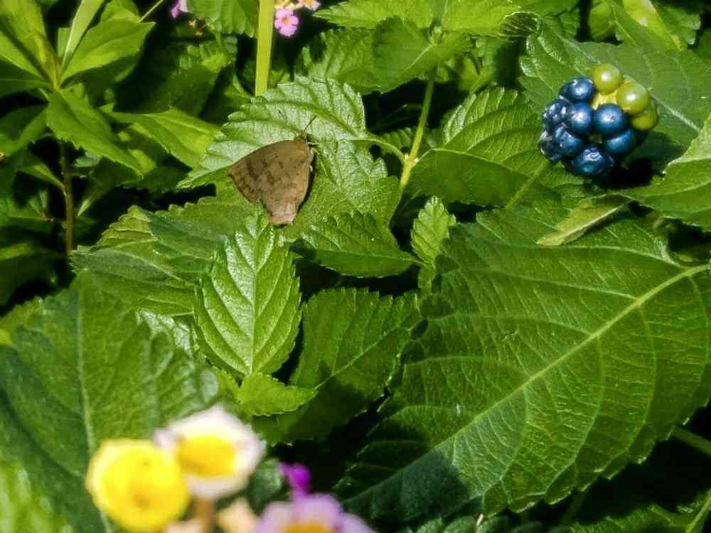 茶色の蝶、ムラサキシジミさんです。翅を開くとキラキラ光るアメジスト柄が格好いいです😍。