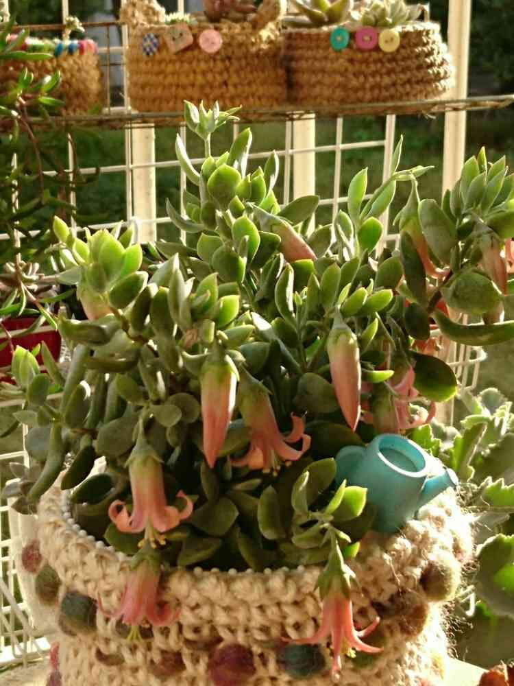 明るいライムグリーンの葉にピンク色のベル🔔のような花 可愛い~😍
