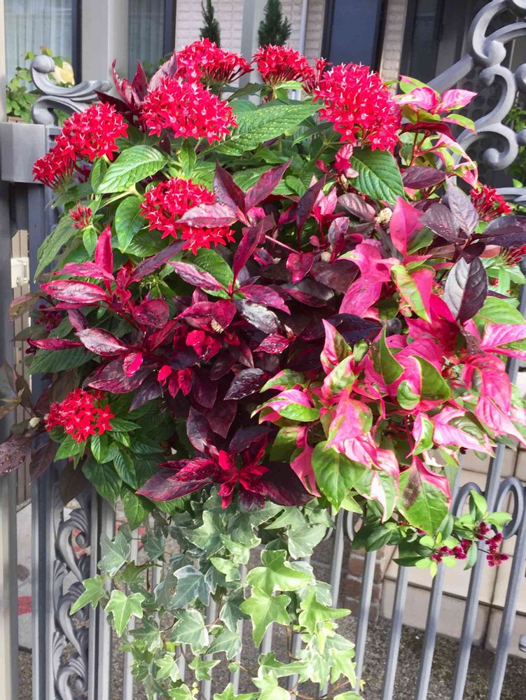ハンギングバスケット、赤と緑で統一されていて素敵ですね✨