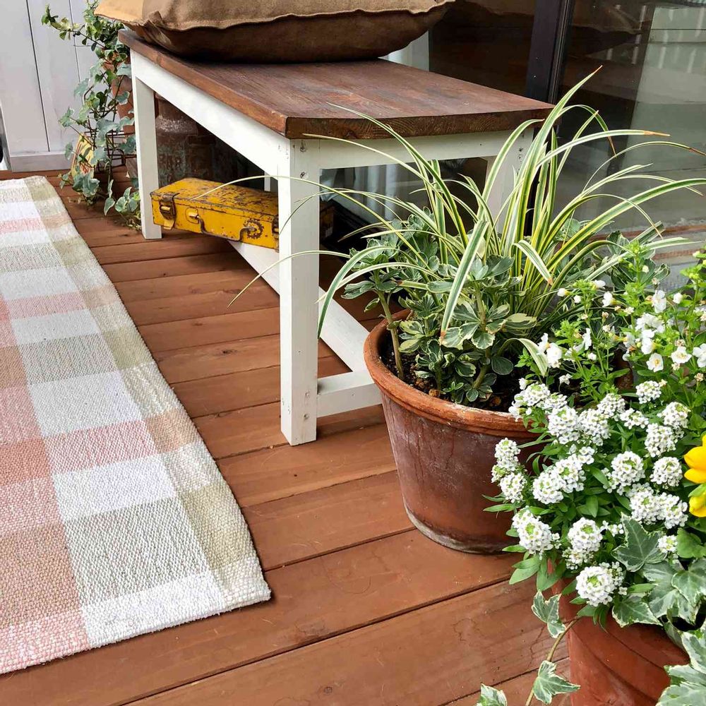 マンションの小さなベランダでガーデニングを楽しんでいます。ウッドデッキ、ウッドフェンス、室外機カバーなどほとんどDIYしました。