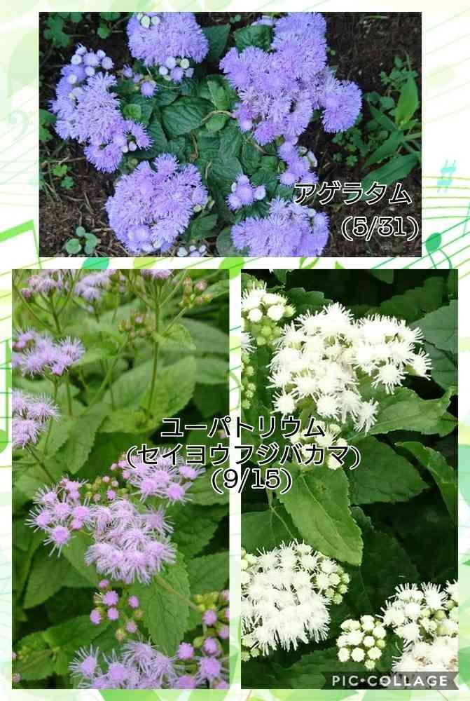 アゲラタムの方が青紫色でユーパトリウムの方は藤色ですね。
