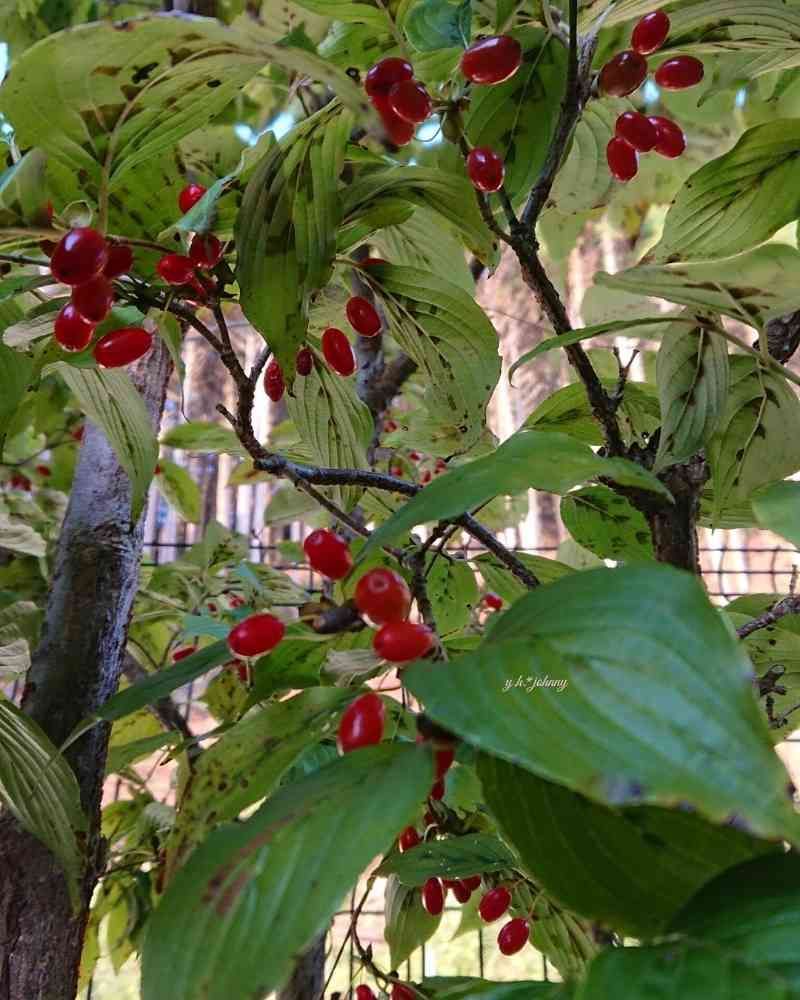サンシュユ、お花は春に園芸店で見た事があるのですが、実は初めて見ました😲 実がなることも知らなかったです、可愛いですね💕