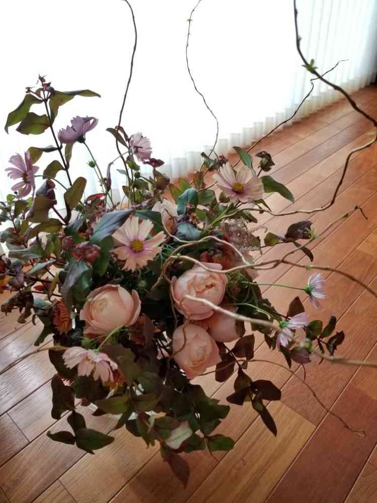 色合いが素敵なコスモスを、高めにピョコピョコ目立たせることを意識しながら組んでいき✨